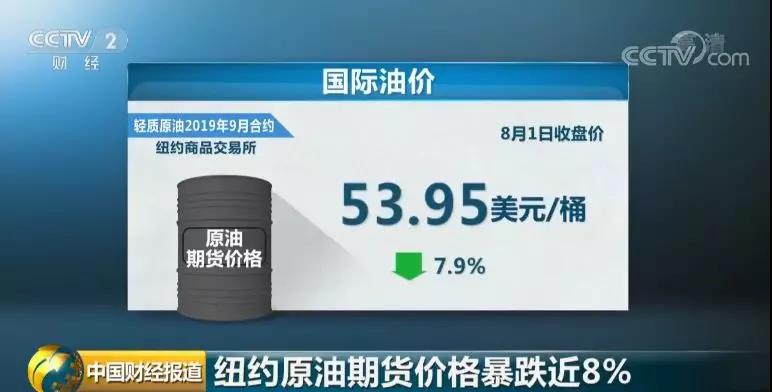对经济发展反应尤为敏锐的国际油价则经历黑色一天。受中东地缘政治局势和全球贸易形势影响,国际油价1日暴跌。截至当天收盘,纽约商品交易所9月交货的轻质原油期货价格收于每桶53.95美元,跌幅为7.9%。10月交货的伦敦布伦特原油期货价格收于每桶60.5美元,跌幅为6.99%。