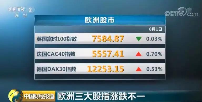 8月1日,欧洲三大股指涨跌不一。英国富时100指数报收于7584.87点,跌幅为0.03%。法国巴黎股市CAC40指数报收于5557.41点,涨幅为0.70%;德国法兰克福股市DAX指数报收于12253.15点,涨幅为0.53%。