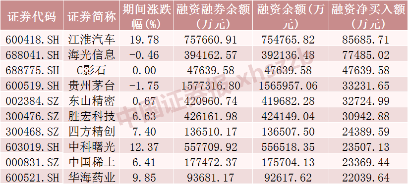 从个股情况来看,6月9日—6月11日融资客对38只股票加仓金额超1亿元,加仓居前的10只股票分别为江淮汽车、海光信息、C影石、贵州茅台、东山精密、胜宏科技、四方精创、中科曙光、中国稀土、华海药业,分别净买入8.57亿元、7.75亿元、4.76亿元、3.32亿元、3.27亿元、3.09亿元、2.44亿元、2.35亿元、2.34亿元、2.20亿元。