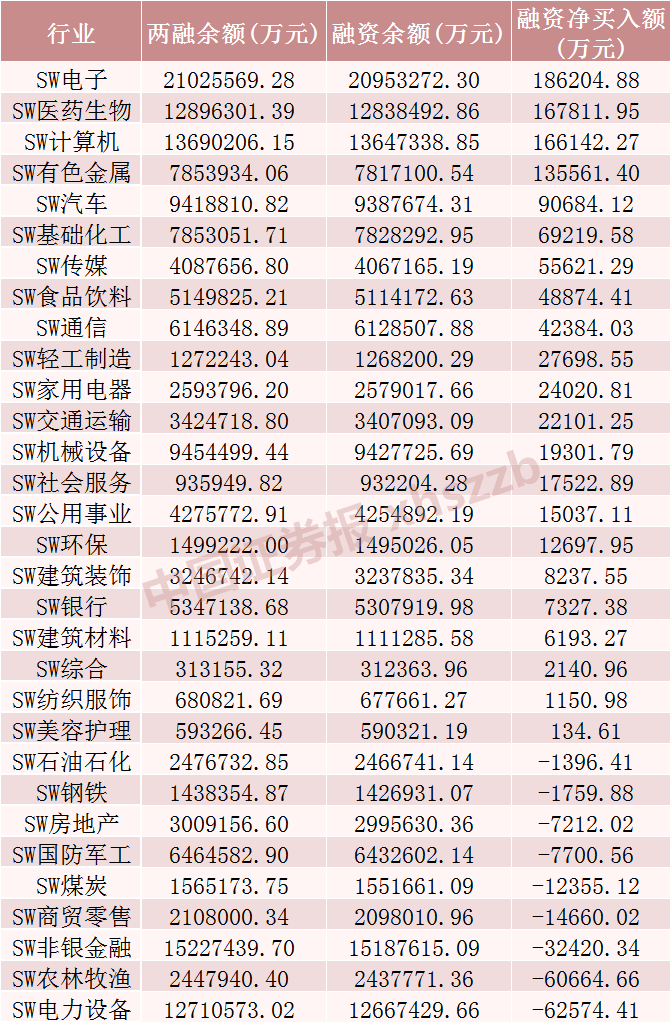 从行业情况来看,6月9日—6月11日申万一级31个行业中有22个行业融资余额增加,电子、医药生物、计算机行业融资净买入金额居前,分别为18.62亿元、16.78亿元、16.61亿元。在融资余额减少的9个行业中,电力设备、农林牧渔、非银金融行业融资净卖出金额居前,分别为6.25亿元、6.07亿元、3.24亿元。
