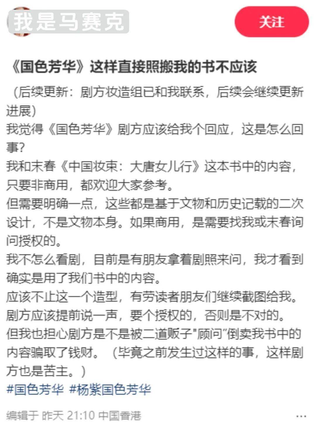 应该很多人之前也吃到了这个瓜,就是《中国妆束》的作者在网上说古装剧《国色芳华》未经授权直接照搬了书中的造型,属于商用。