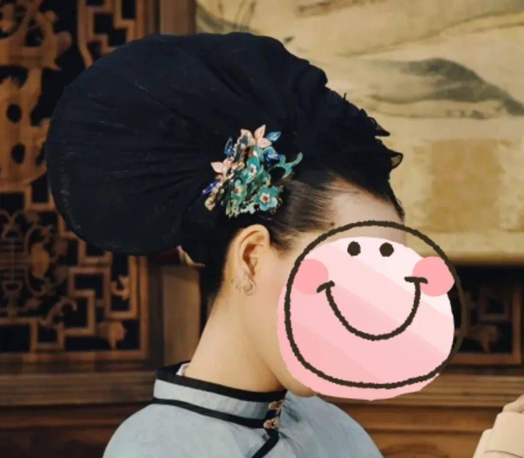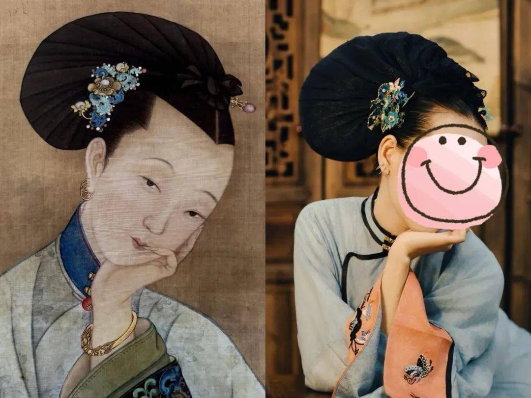 但也没有做成什么特别奇怪的东西,而是做成了清宫剧里“剪秋姑姑”的那种发型。很显然,比起古画里的样子,这个仿版更熟悉清宫剧里的那些发型。