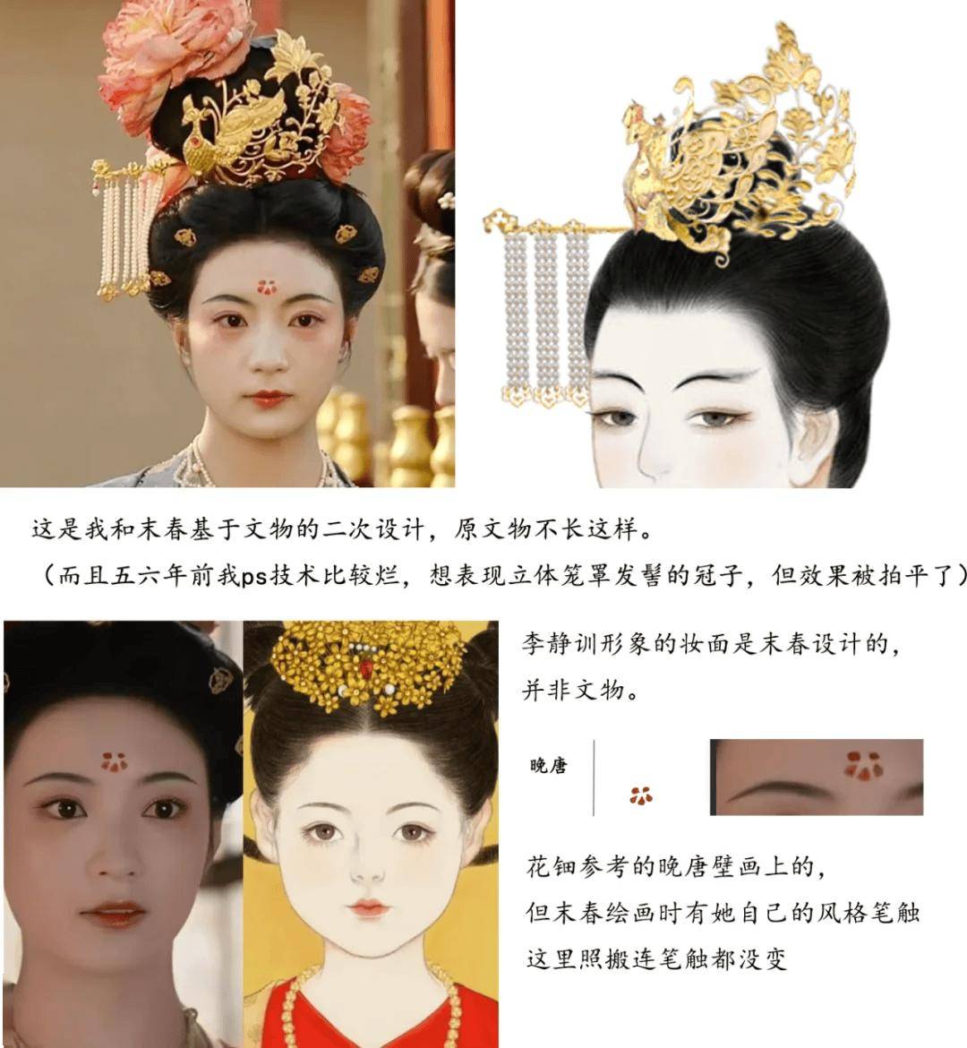 这个瓜里最好判定的其实是《国色芳华》有没有参考《中国妆束》这本书?一定是看了,而且剧组大概率看的参考资料也不会很多,尤其是偏向于壁画原貌、文物原照、研究论文等这类没有被“加工”成可直接参照的形象资料剧组应该是看得很少,不足以支撑剧组在细节处填上这本书以外吸收到的认知(真看了我上面那些内容就该是剧组或者粉丝搬出来了,而不是等这剧都播完了、凉透了我这个没看过剧的人冒着得罪人的风险来一一列出)。