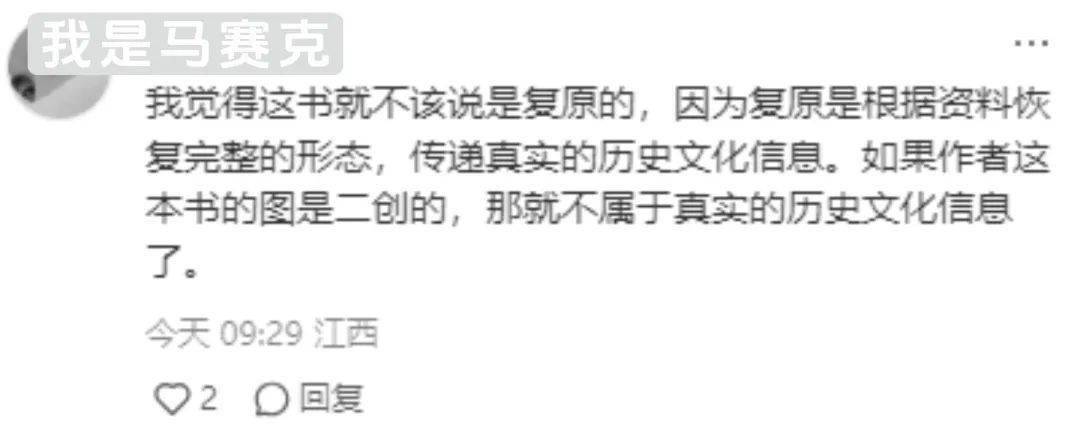 从相关讨论帖的评论区也可以看出,的确很多人是分不清这类书籍的“二创”,这里不仅包括是否了解复原绘画是否存在“二创”,还包括如何分辨绘画中哪些部分是属于“二创”的。毕竟,如果有些部分是从文物转绘而来,不存在二次设计,即便有一些商用使用了“照搬”方式也很难界定为侵权(此处使用的是公众标准,亚文化圈或粉圈那种创意类似就算抄袭的逻辑不在此列)。