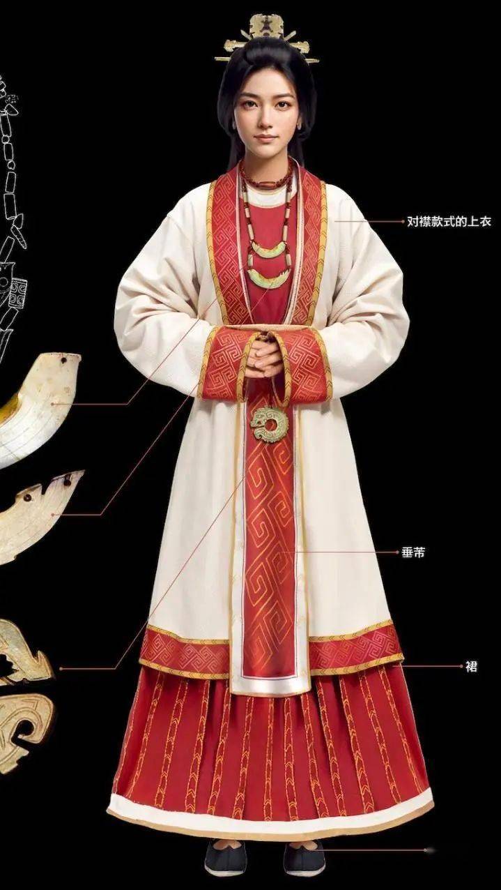 其实这两个形象的源头都是之前发布的“数智人妇好”,且不说这类“数智人”的侧重点并不完全是形象上的考证复原(大家可以想想马王堆辛追数智人),只说看图做造型也是错得离谱,连服饰结构也完全不一样。