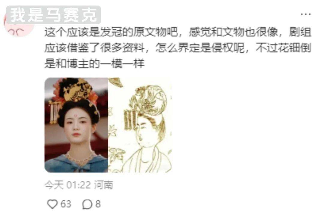 比较难以判定的是这种参考算不算一种抄袭(虽然作原帖的用词是“照搬”)?这个难点不在于《国色芳华》剧照与《中国妆束》插图的相似程度有多高,而在于《中国妆束》插图在文物资料基础上的再创作成分有多少,是否拥有创作的独特性和专属性。