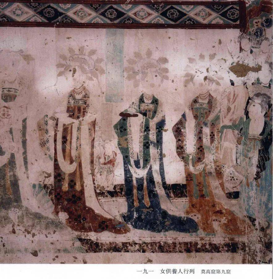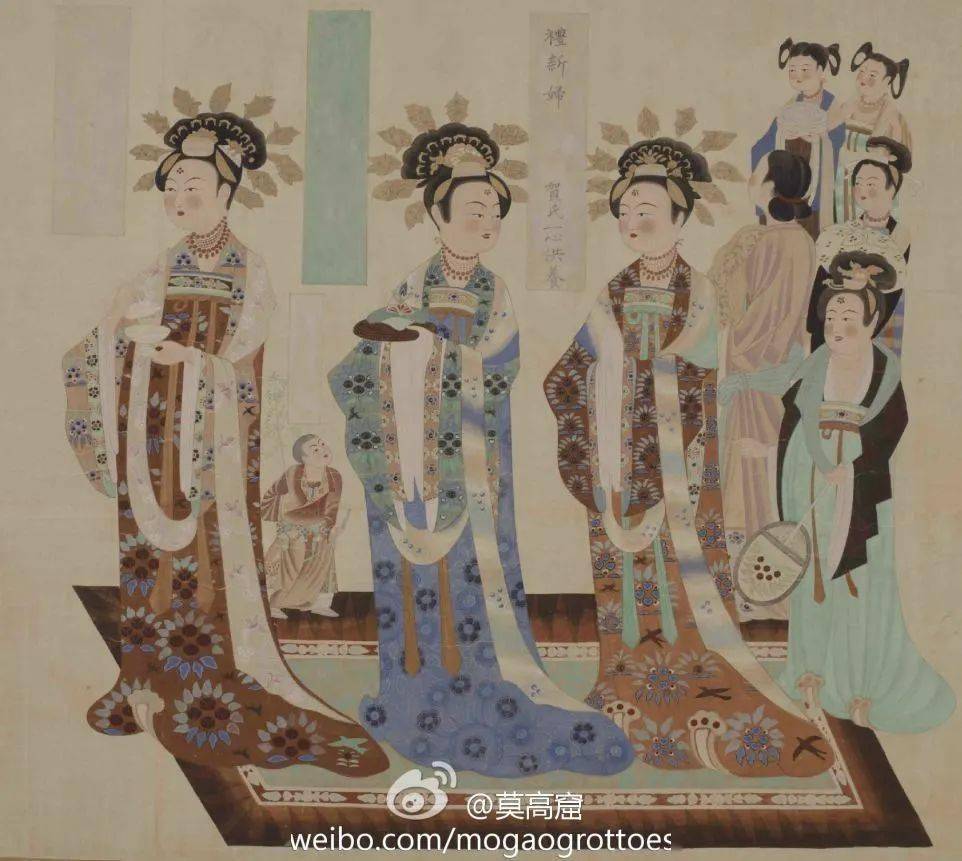 只说这个花钿吧。作者只在小红书笔记里提到了参考对象是“晚唐壁画”,没提具体信息,应该是莫高窟第9窟供养人像的史苇湘临摹版,定语这么长是因为原壁画已经看不出有花钿了。