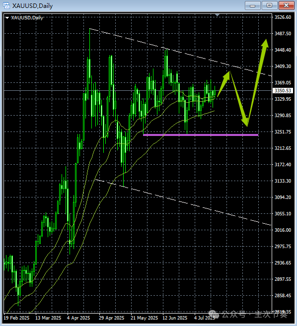 近几周的发展已经可以清晰看到,黄金就是一段高位的反复震荡整理,这不是转跌的特征,也就意味着可以定性是回调性质。接下来几周黄金整体是强势的,但延续性可能较差,频繁的涨跌交替运行还将延续。然而,越是长时间的震荡,越有助于下一轮冲高。Update: 2025-7-6