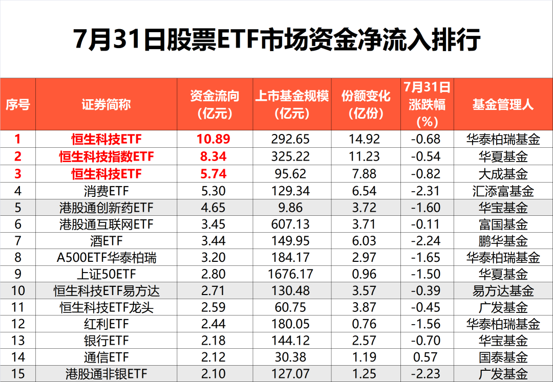 具体到指数维度,7月31日恒生科技指数资金净流入居前,达33.05亿元。其中,华泰柏瑞基金、华夏基金、大成基金旗下跟踪该指数的ETF产品,跻身资金净流入前三强。