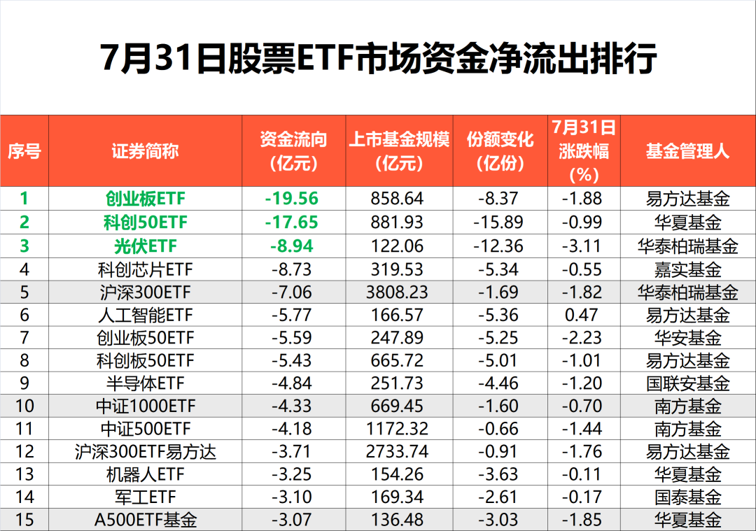 7月31日股票ETF市场资金净流出超100亿元