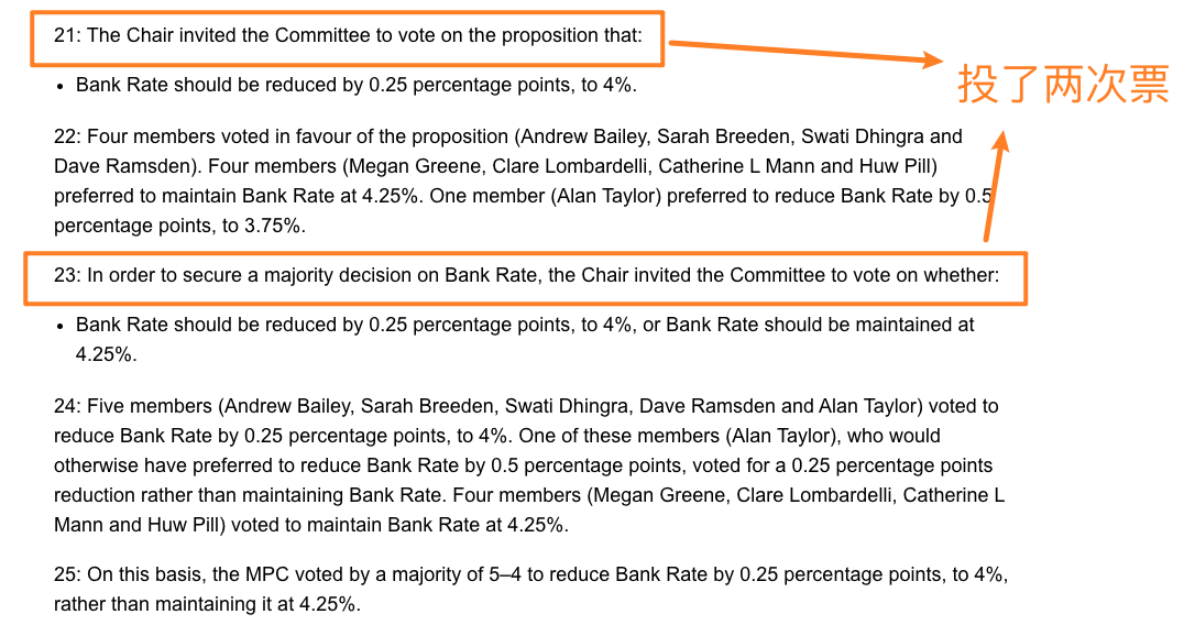 英国央行介绍称,在9人构成的货币政策委员会中,包括行长贝利在内的4名委员投票支持降息25个基点,另一名委员艾伦·泰勒原本倾向于降息50个基点,但因为投票僵局最终支持更小幅度的降息。包括英国央行副行长隆巴德利、首席经济学家休·皮尔在内的4人则坚持不应该降息。