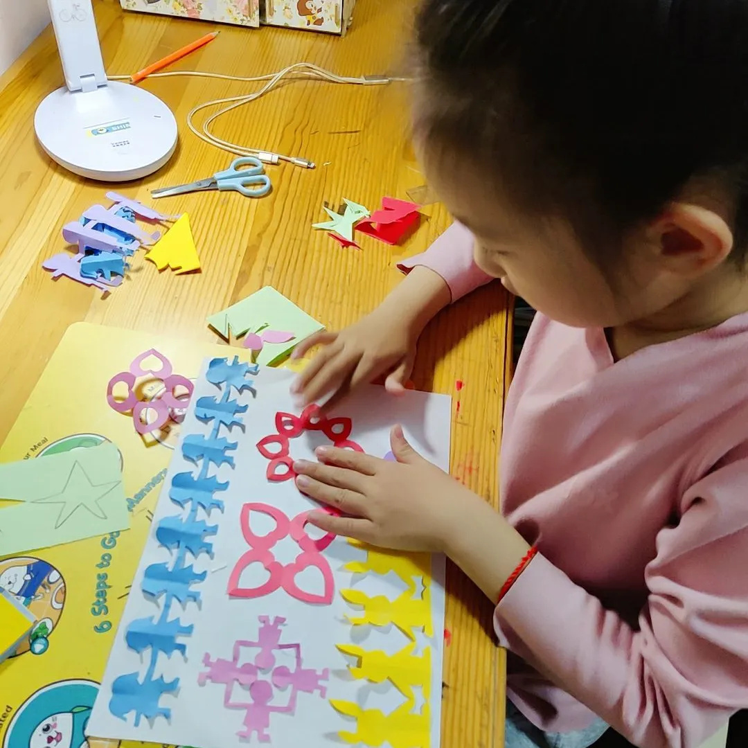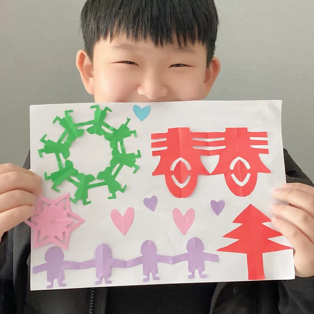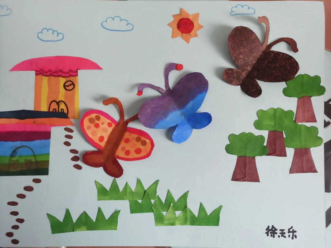 线上教学使四年级学生认识并掌握了轴对称图形的特点,线下四年级的学生们开动脑筋,发挥创意,设计出一幅幅轴对称粘贴画。
