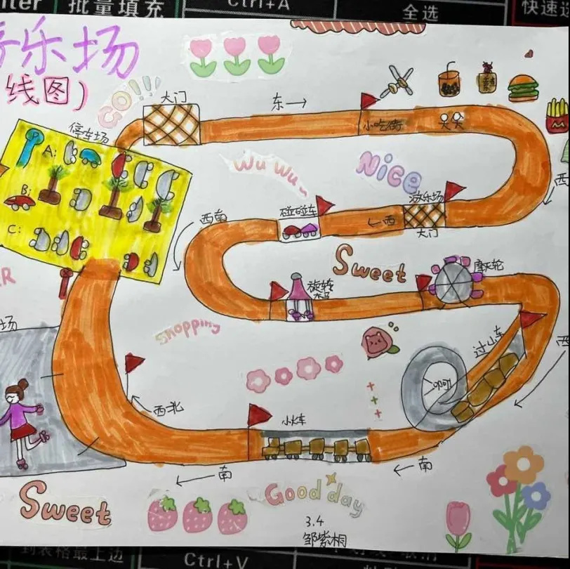 三年级将位置方向与路线图相结合,设计“云行走”作业。学生熟练辨别地图上的方向,准确绘制路线图,在此过程中锻炼了学生的动手能力,发展了数学思维。
