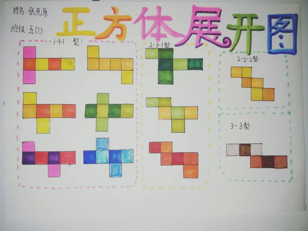 五年级学生在画一画、涂一涂的过程中,发现了正方体展开图的基本特点,进行分类整理,完善正方体展开图的结构体系。进一步认识了立体图形与平面图形的关系。五年级的同学用彩笔勾画出一张张精美的正方体展开图,展现不一样的精彩。
