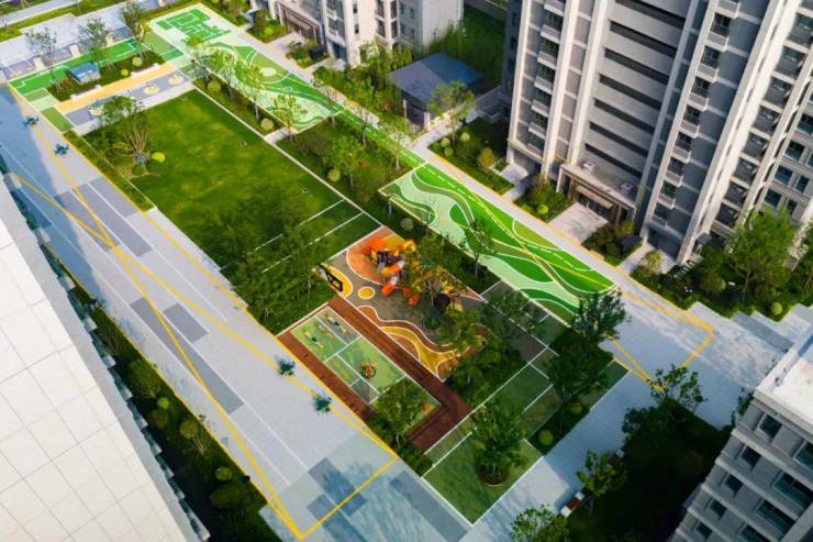 步入社区,一条充满活力的中央景观轴线贯穿始终,沿途邻里花园、森林会客厅、全龄健身游乐场三大主题景观依次展开。