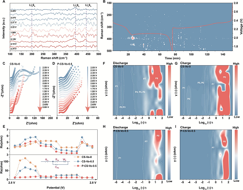 图5. A-B 采用P-CS-Vo-0.5隔膜的电池在充放电过程中不同电压下测得的原位拉曼光谱及对应的拉曼曲线;C-D 采用CS-Vo-0和P-CS-Vo-0.5隔膜的电池在0.2C下的原位电化学阻抗谱(EIS)奈奎斯特图,以及E 不同充放电深度下欧姆电阻Ro和电荷转移电阻Rs的拟合结果;F-G CS-Vo-0和H-I P-CS-Vo-0.5在不同电压下由EIS测量结果计算得到的弛豫时间分布(DRT)等高线图。