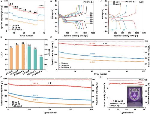 图6. A 不同电流倍率下的倍率性能;B P-CS-Vo-0.5隔膜电池的恒电流充放电(GCD)曲线C下不同电极的GCD曲线比值与极化电压(ΔE);E-F 0.5C和4C下的长期循环稳定性测试结果;G 高硫负载条件下的容量保持率(插图为搭载P-CS-Vo-0.5隔膜的锂硫电池点亮LED的照片)。