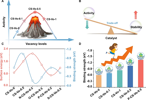 密度泛函理论(DFT)模拟揭示了多硫化物吸附能与空位浓度间的非线性关系。随着空位浓度增加,吸附强度先增强后减弱,形成火山型吸附曲线A)。低空位浓度阻碍了足够活性位点的形成,而高空位浓度导致显著的几何损伤或活性降低。催化剂活性与稳定性间存在固有跷跷板关系(图1B)。采用非金属原子修饰催化剂以稳定空位,是调和这一内在矛盾的有前景方法。CS-Vo-0的表面能为0.86 eV,空位形成后(CS-Vo-0.5)增至1.59 eV,表明富空位表面具有固有不稳定性。采用N-CS-Vo-0.5、S-CS-Vo-0.5、O-CS-Vo-0.5和P-CS-Vo-0.5的优化模型确定结合能与表面能(图1C)。结果显示,掺杂后表面能先升高后降低,主要归因于掺杂剂诱导的晶格畸变程度。
