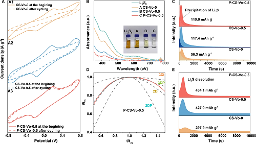 图3. A. 对称电池初始阶段与循环后的循环伏安(CV)曲线;吸附实验照片及对应的紫外-可见(UV-Vis)光谱图;C. LiS成核过程;D. P-CS-Vo-0.5的无量纲瞬态曲线(对应成核过程);E. 不同催化剂作用下LiS的解离过程。