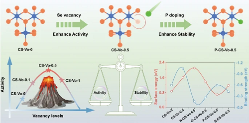 2.首次提出一种新型“杂原子协同锚定空位”策略,以实现保留丰富硒空位的磷掺杂CoSe(P-CS-Vo-0.5)。3.证实磷(P)掺杂可降低硒(Se)空位表面能并有效“固定”活性位点,显著抑制空位的动态迁移。