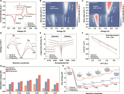 图4. A 循环伏安(CV)曲线和C P-CS-Vo-0.5在不同扫描速率下的CV图等高线图;D 两种硫正极的相对活化能;E 塔菲尔(Tafel)曲线;F 绝对温度(T)的倒数与电荷转移电阻倒数对数之间的线性关系;G 计算所得硫物种的吸附能,以及H相对自由能。