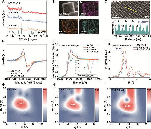 硼氢化物诱导产生的空位增强了催化剂的活性,而磷(P)原子的引入则提升了其稳定性。DFT计算表明,与替代掺杂相比,P优先填充CS-Vo-0.5晶格中的硒(Se)空位,形成更稳定的构型。CS-Vo-0、CS-Vo-0.5和P-CS-Vo-0.5的X射线衍射(XRD)图谱如图2A所示,其中P-CS-Vo-0.5未出现磷化钴的特征峰,表明磷的引入未破坏晶体结构。透射电子显微镜(TEM)图像显示,P-CS-Vo-0.5保持了中空立方形貌,证实其在NaBH处理后结构未发生改变。元素分布图表明,Co、Se和P元素在P-CS-Vo-0.5样品中均匀分布(图2B)。