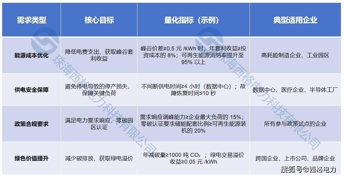 制定储能技术路线图的首要步骤是精准诊断企业储能需求,避免 “为建储能而建储能”。需从 “能源成本优化、供电安全保障、政策合规要求、绿色价值提升” 四大维度切入,结合企业行业属性、用能特征、发展规划,量化储能的核心目标与关键指标。