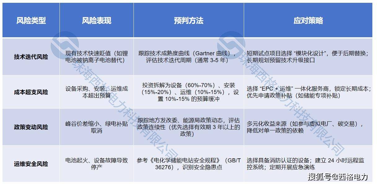 低风险项:设备迭代(概率 20%,影响程度 30%),应对策略:选择模块化电池簇,可单独替换升级。