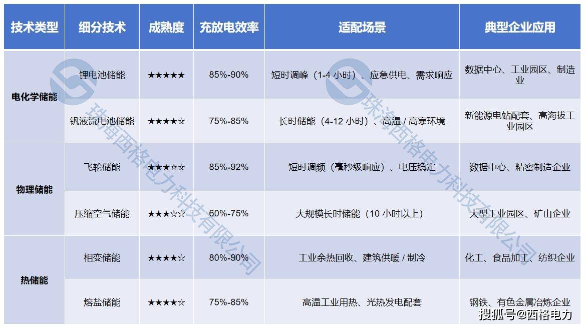 企业储能技术路线选择需避免 “盲目追逐热门技术”,而是基于需求诊断结果,从 “技术成熟度、经济性、适配场景、运维难度” 四维度评估,筛选与企业用能特征最匹配的技术类型。当前主流企业级储能技术可分为 “电化学储能、物理储能、热储能” 三大类,其细分技术特性差异显著。
