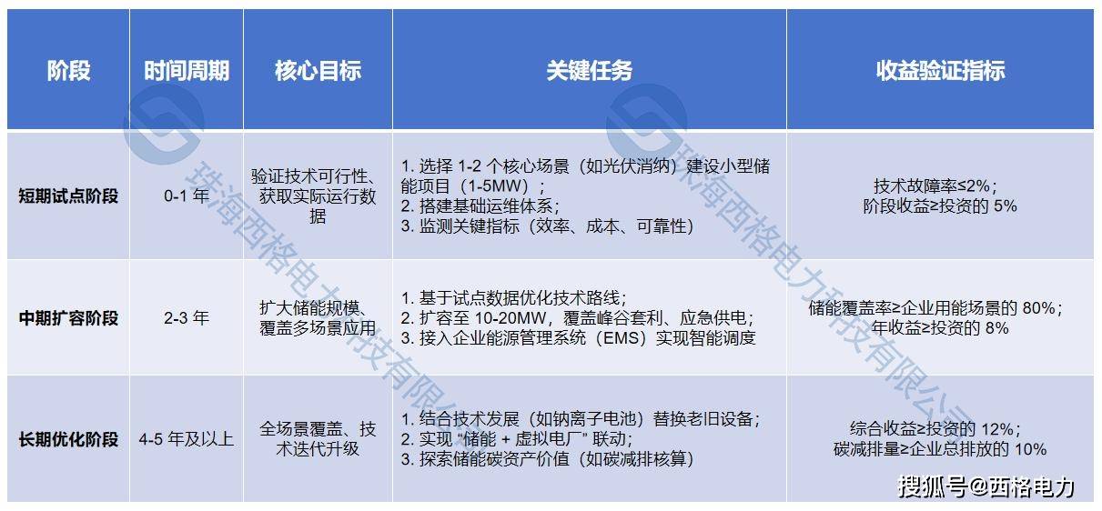 企业储能技术路线图需避免 “一步到位” 的激进策略,而是结合企业资金预算、用能增长规划、技术迭代节奏,制定 “短期试点 - 中期扩容 - 长期优化” 的分阶段实施计划,确保每阶段均能实现明确收益,降低投资风险。
