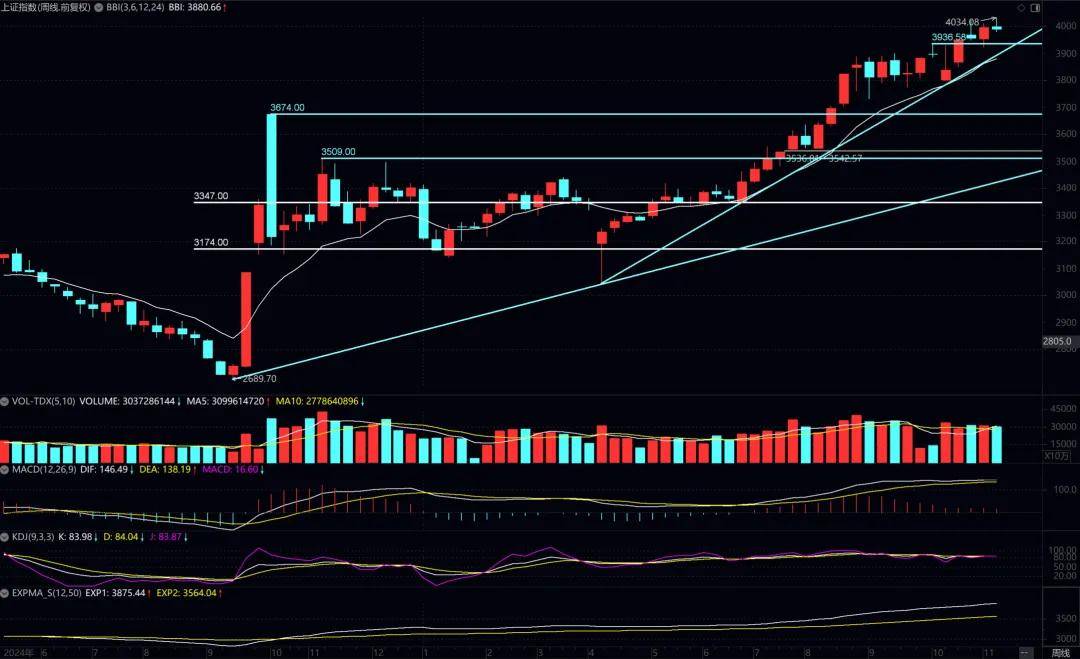目前牛市状态,中期强势,周级别再冲会有休整要求;短期日级别可上可下。压力已显,风险已显,能否确保不失3980成关键。具体来说:周初确保不失3980并站回4000才有转圜余地,一旦失守3980就难免走弱了;一旦走弱就需观察月级别调整是否会就此展开,若跌破3920月级别调整就基本确认了。突破4013-4034才有望再攻4051-4070一带,攻击前者的可能性有,攻击后者的可能性不大,上攻极限应不会超过4070太多。接下来想再攻若量能不济就难免失败。若意外周失守3920就会产生不确定性。