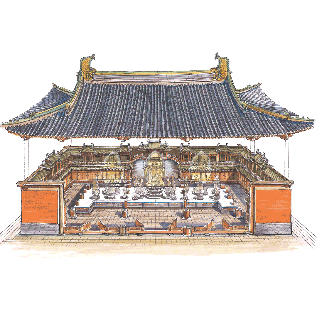 “掀开”屋顶,地面上的结构布局才能一览无余。比如大同华严寺薄伽教藏殿,作为“八大辽构”之一,内部不仅保留着精美的雕塑,还有巧夺天工的藏经壁橱,其上的“天宫楼阁壁藏”更是被梁思成誉为“海内孤品”。大殿内部光线幽暗,很难看清壁藏的细节。李乾朗索性将屋顶抬起来,于是壁藏构造清晰可见——长廊式的壁藏围绕后墙铺开,分两层,二层有7座楼阁,3座为重檐顶,4座为单檐顶……