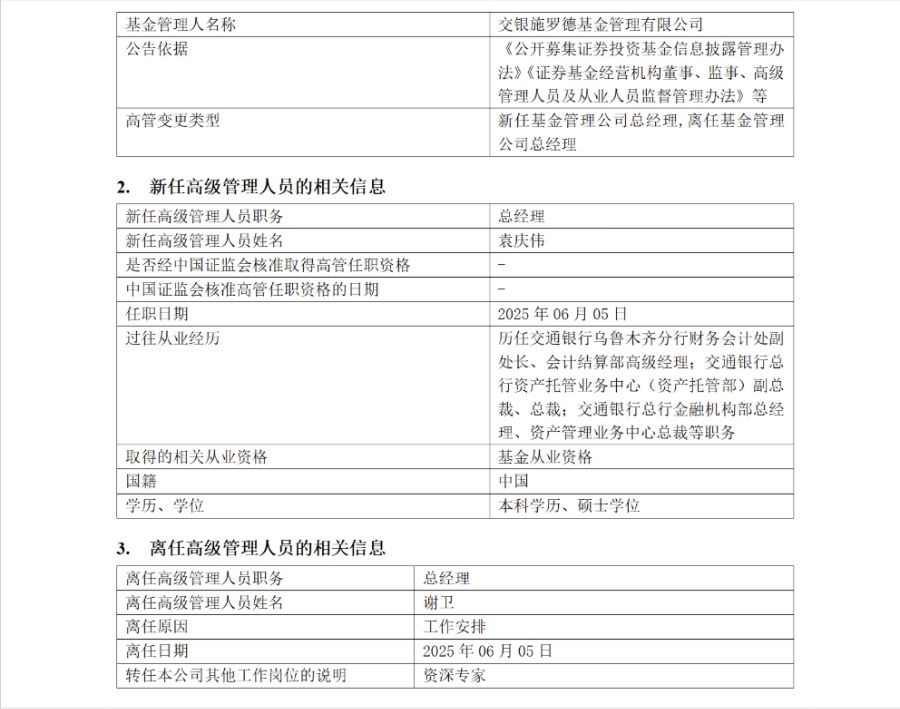 6月6日,交银施罗德基金发布高管变更公告,公司原总经理谢卫转任资深专家,总经理一职由原交通银行总行金融机构部总经理、资产管理业务中心总裁袁庆伟接任。