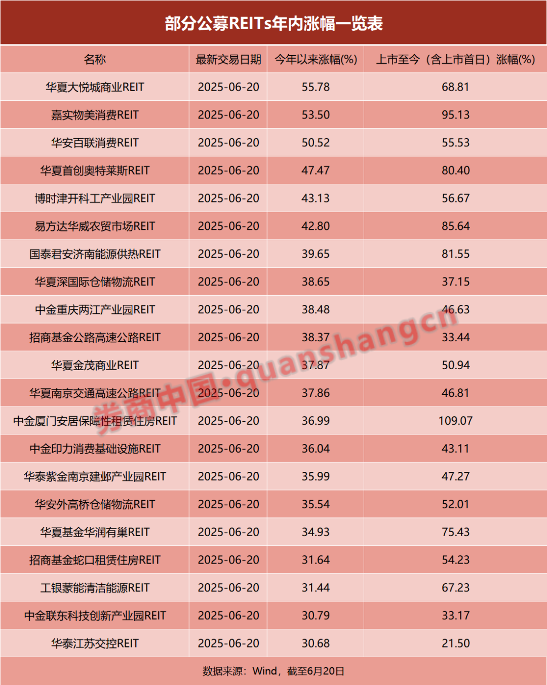 截至6月20日收盘,全市场的公募REITs产品数量已超过了85只,底层资产扩展已扩展至十大类型。其中,66只已上市的公募REITs产品,年内平均涨幅超过20%,最高涨幅已超50%。业内人士表示,政策支持叠加市场运行效率、底层资产多样性、投资者认知水平等方面的持续改善,公募REITs有望迎来进一步发展。