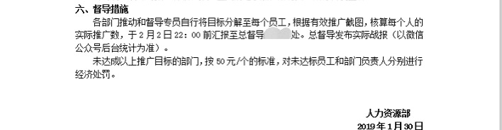 江西某医药企业的受访员工王欣(化名)向澎湃新闻提供的一份致良知四合院的内部“推广文件”写道:致良知是中华文化的集大成者,借助其微信公众号,不但能在社会上传递爱心,而且能提升企业的格局和境界。该推广计划要求,在2019年2月1日晚9点前,公司内部员工均要完成关注,并在亲友间宣传。为此,该公司甚至设计了具体的推广目标和督导专员,且由公司统一设计图文海报。如果未能在指定时间完成计划的,按照每个50元的标准对未达标员工和部门负责人进行扣罚。