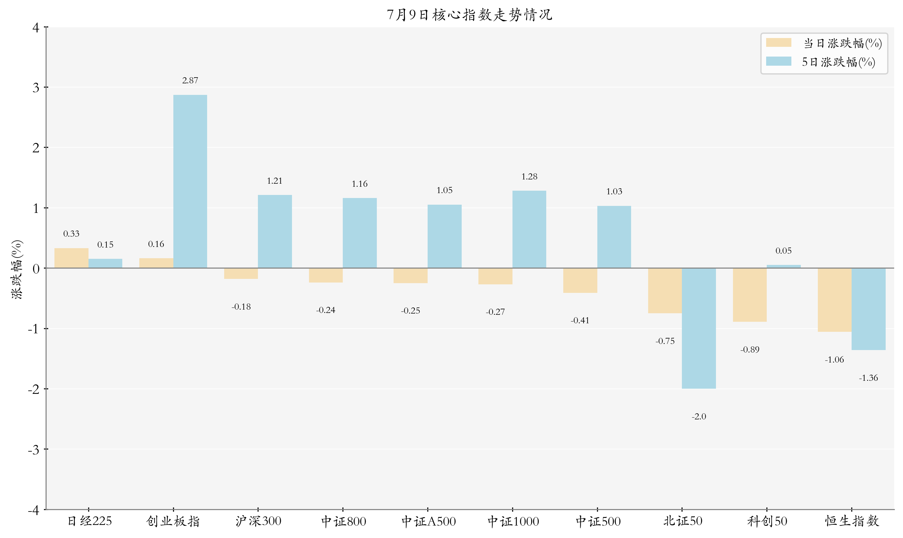 统计A股与海外主要核心指数走势,今日(7月9日,下同)三大指数涨跌不一,其中上证指数下跌0.13%,收于3493.05点,日内最高3512.67点;深证成指下跌0.06%,收于10581.8点,日内最高10656.58点;创业板指上涨0.16%,收于2184.67点,日内最高2204.64点。今日日经225、创业板指与沪深300走势排名靠前,日涨跌幅分别为0.33%、0.16%与-0.18%;近5个交易日创业板指、中证1000与沪深300的走势排名靠前,近5日涨跌幅分别为2.87%、1.28%与1.21%。