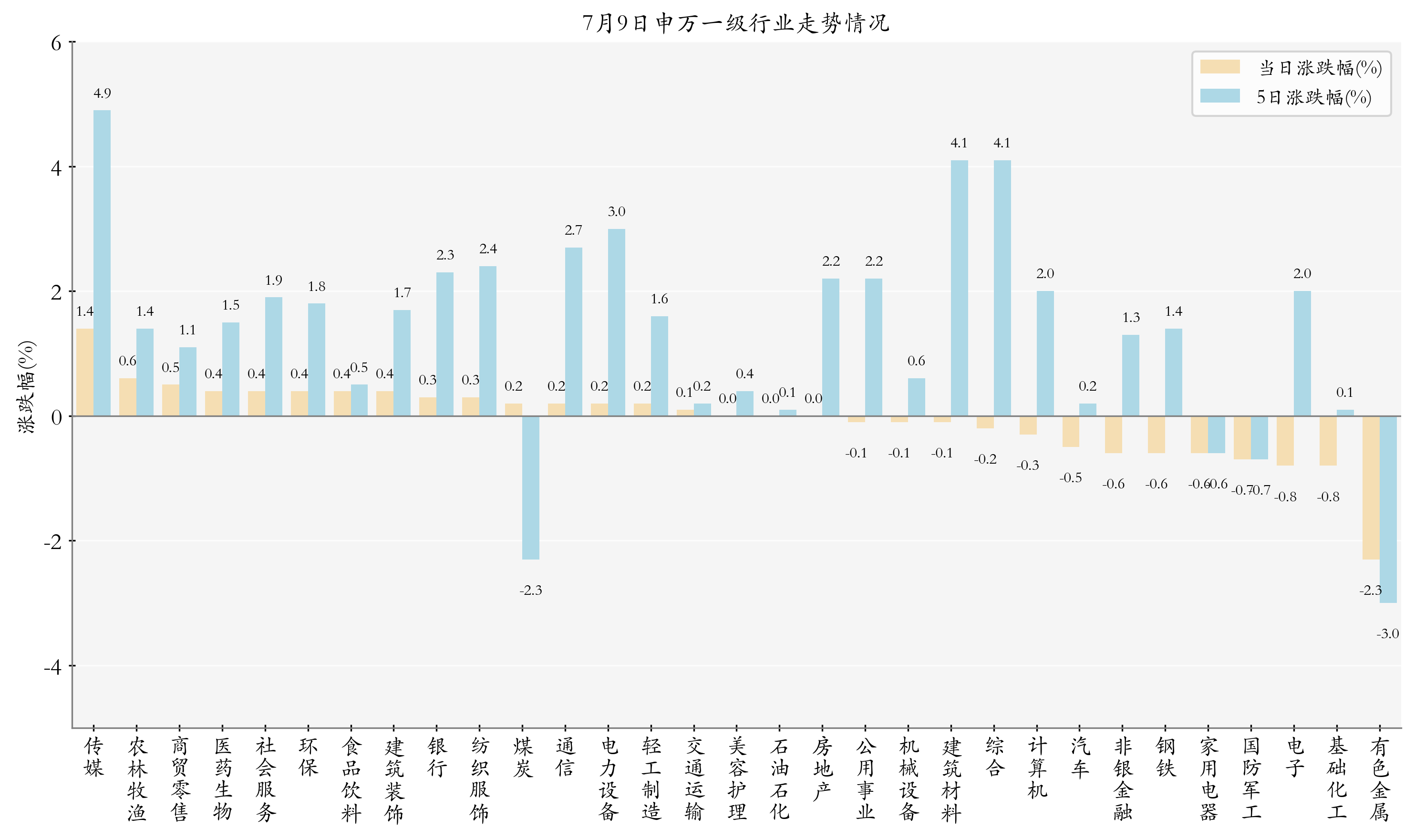 统计今日全部申万一级行业涨跌幅情况,传媒、农林牧渔与商贸零售今日走势排名靠前,日涨跌幅分别为1.35%、0.65%与0.48%,有色金属、基础化工与电子的走势排名靠后,日涨跌幅分别是-2.26%、-0.85%与-0.82%;近5个交易日传媒、建筑材料与综合的走势排名靠前,近5日涨跌幅分别为4.9%、4.09%与4.08%,有色金属、煤炭与国防军工的走势排名靠后,近5日涨跌幅分别为-2.95%、-2.3%与-0.71%。