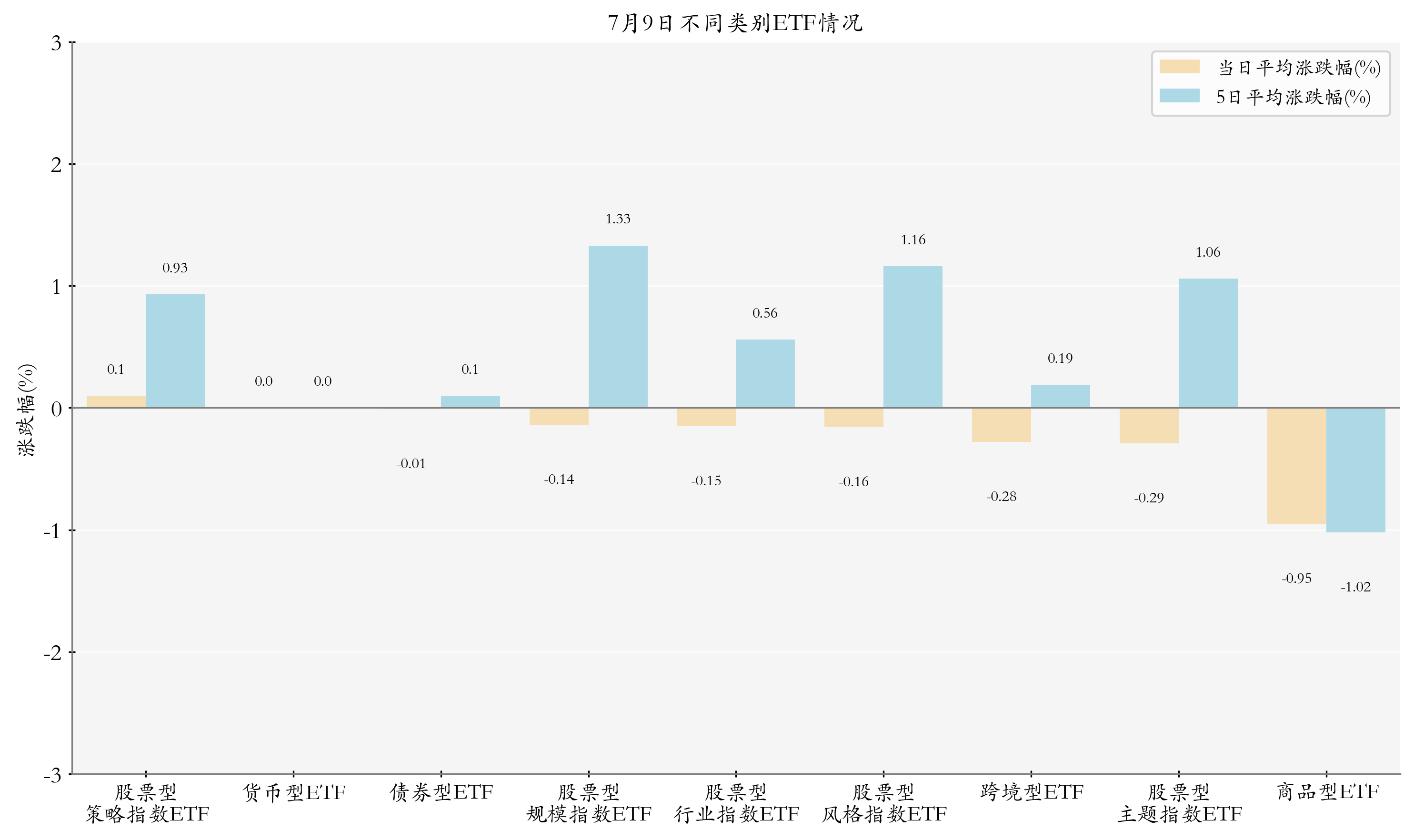 根据ETF基金的投资范围,将ETF基金划分为股票型规模指数ETF、股票型行业指数ETF、股票型策略指数ETF、股票型风格指数ETF、股票型主题指数ETF、债券型ETF、商品型ETF、货币型ETF、跨境ETF,今日股票型策略指数ETF表现最优,该类ETF的平均涨跌幅为0.10%;商品型ETF的表现最差,该类ETF的平均涨跌幅为-0.95%。