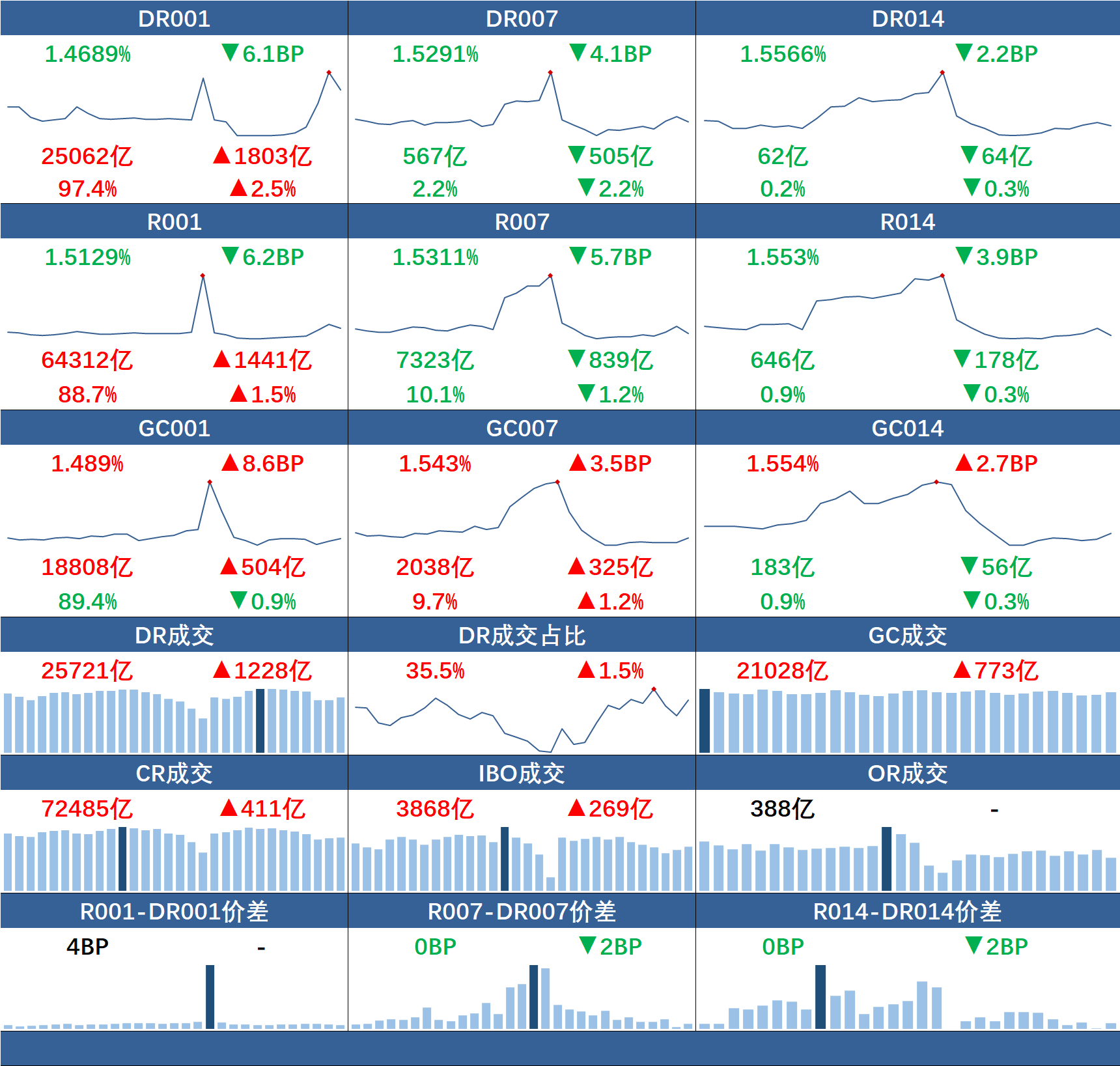 银行间质押式回购市场方面,隔夜品种量升价跌,短期资金利率围绕1.5%附近震荡。具体看,DR001、R001加权平均利率下行6.1BP、6.2BP,报1.4689%、1.5129%,成交额分别增加1803亿元、1441亿元;DR007、R007加权平均利率分别下行4.1BP、5.7BP,报1.5291%、1.5311%,成交额分别减少505亿元、839亿元;DR014、R014加权平均利率分别下行2.2BP、3.9BP,报1.5566%、1.553%,成交额分别减少64亿元、178亿元。
