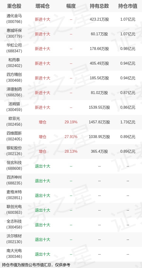 证券之星消息,7月18日广发基金旗下罗国庆管理的广发中证1000交易型开放式指数基金公布中报,近1年净值增长率37.8%。与上一季度相比,该基金前十大重仓股新增通化金马,惠城环保,华虹公司,和而泰,四方精创,泽璟制药,汤姆猫;并对欧菲光增仓329.4万股,为该基金第一大重仓股;恒玄科技,百济神州,麦格米特,联创光电,全志科技,沃尔核材,南大光电等退出前十大重仓股;详细数据如下: