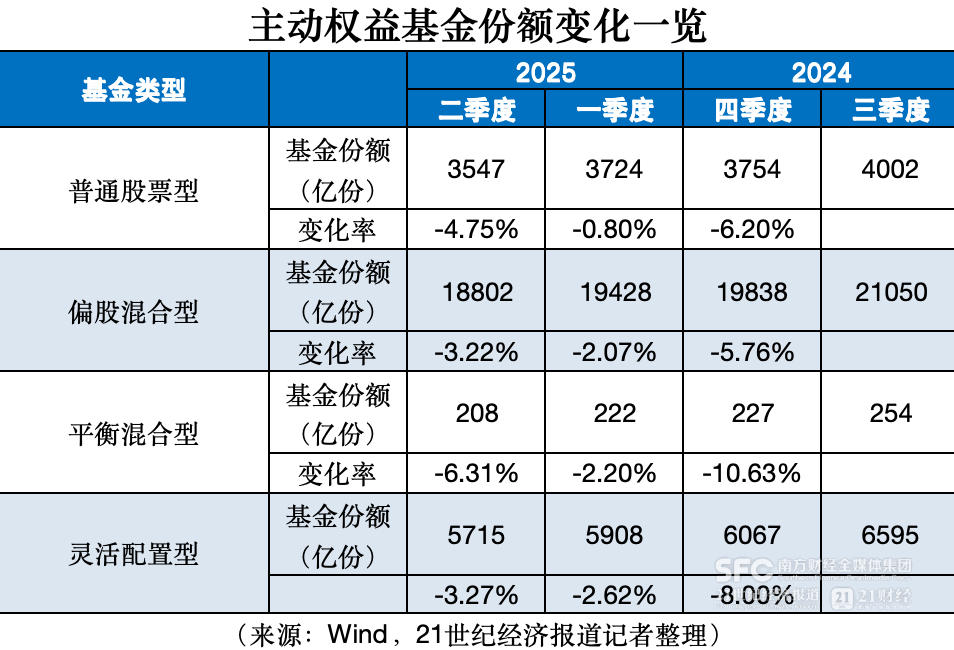 21世纪经济报道记者据Wind数据统计,2025年二季度,在主动权益基金(注:剔除新发基金影响,选择“基金成立超过1年”,即基金在2024年二季度之前成立)中,普通股票型基金被净赎回了4.75%,偏股混合型、平衡混合型、灵活配置型基金分别被净赎回3.22%、6.31%、3.27%,相较于2025年一季度的0.80%、2.07%、2.20%、2.62%,二季度主动权益基金的赎回速度加快了。