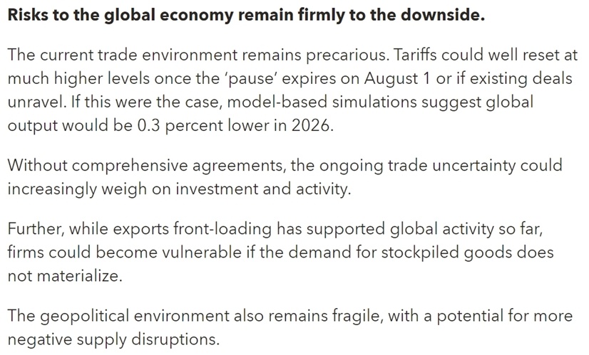报告同时警告,受美国关税可能反弹、地缘政治紧张和财政赤字扩大等因素影响,世界经济仍面临重大风险,贸易紧张态势仍在损害世界经济。