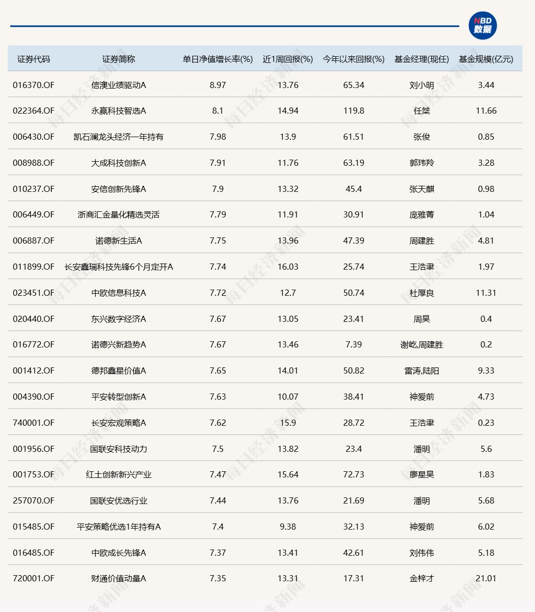 Wind数据显示,全市场基金今天涨超7%的有31只,涨超6%的有103只,涨超5%的有223只;而跌超1%的仅26只。