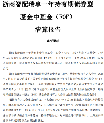 报告称,浙商智配瑞享一年持有期债券型基金中基金(FOF)于2022年7月19日起基金合同生效,基金合同生效日的基金份额总数为530,060,349.44份(含募集期间利息结转的份额)。自2022年7月19日至2025年7月23日期间,本基金按基金合同约定正常运作。因为市场环境变化,本基金规模存量较小,为保护基金份额持有人的利益,根据《中华人民共和国证券投资基金法》、《公开募集证券投资基金运作管理办法》、本基金基金合同等有关规定,并经与本基金托管人协商一致,公司提议召开基金份额持有人大会对终止《基金合同》并进行基金财产清算事宜进行审议。基金管理人已于2025年6月17日发布《浙商基金管理有限公司关于以通讯方式召开浙商智配瑞享一年持有期债券型基金中基金(FOF)基金份额持有人大会的公告》,并于2025年7月17日表决通过了《关于终止浙商智配瑞享一年持有期债券型基金中基金(FOF)基金合同有关事项的议案》,本基金自2025年7月24日起进入基金财产清算程序。