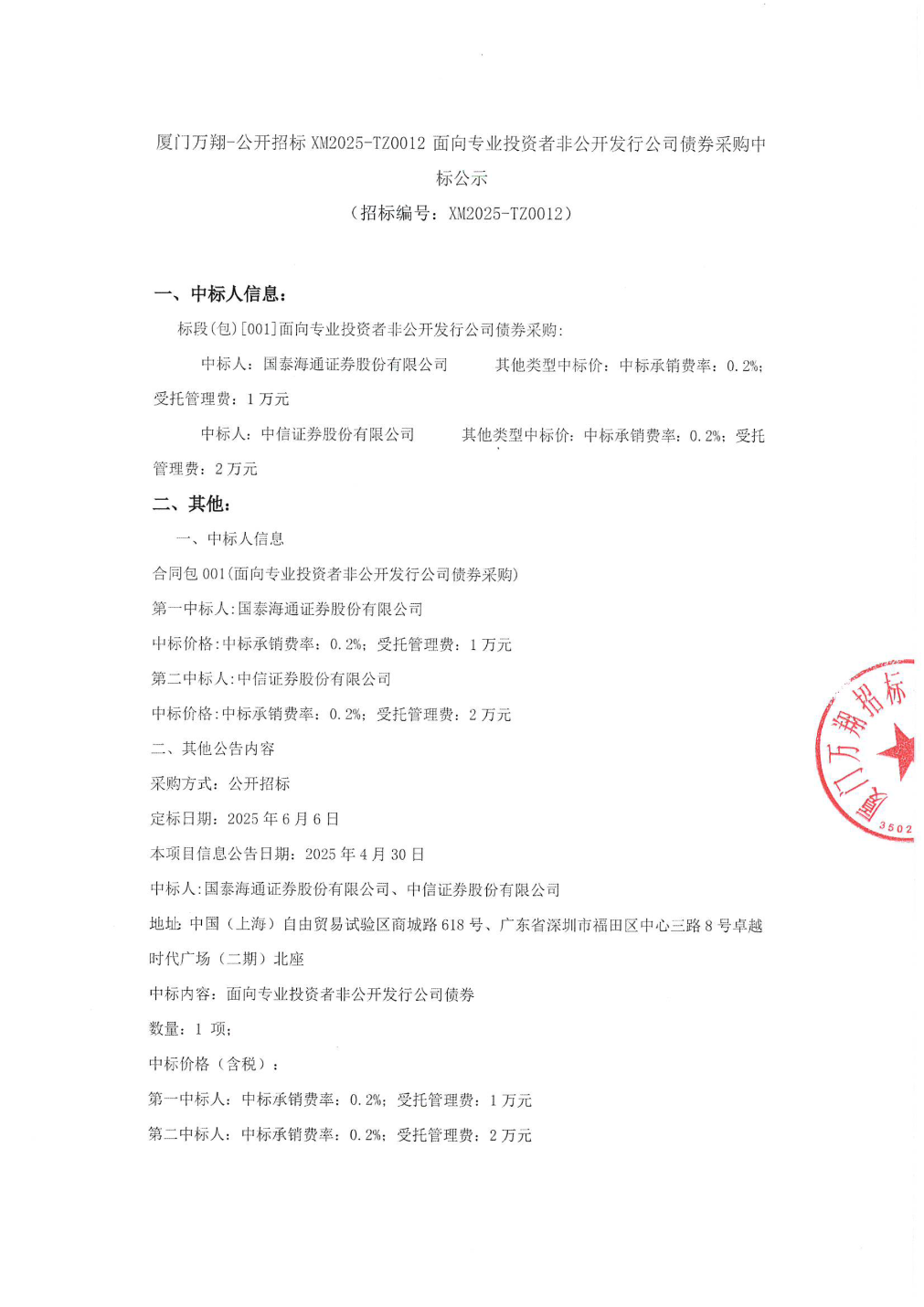 国泰海通中标结果:厦门万翔-公开招标XM2025-TZ